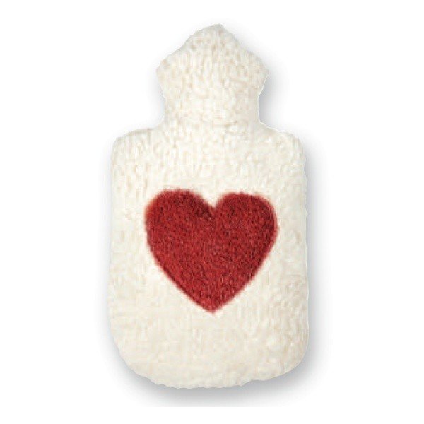 Un coeur rouge est cousu sur le cache-bouillotte. En coton peluche, cette bouillotte à eau est extrêmement douce.