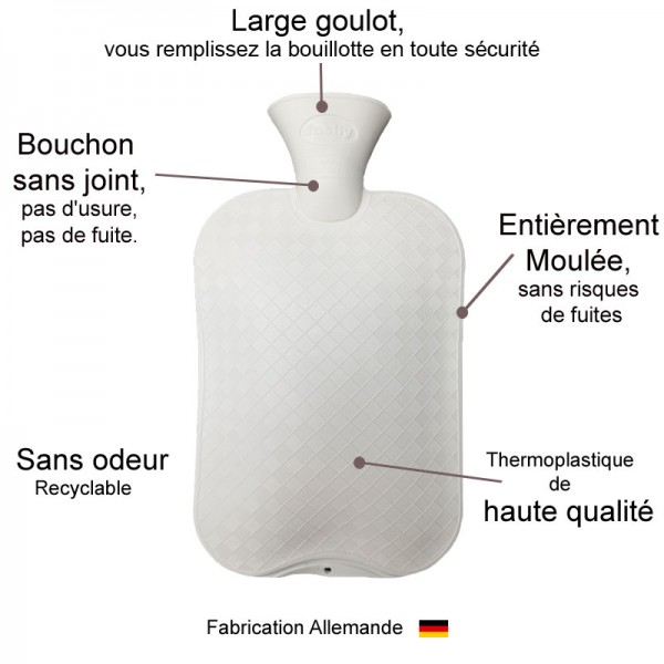 - Fabriqué en: Allemagne (bouillotte) et Indonésie (housse)