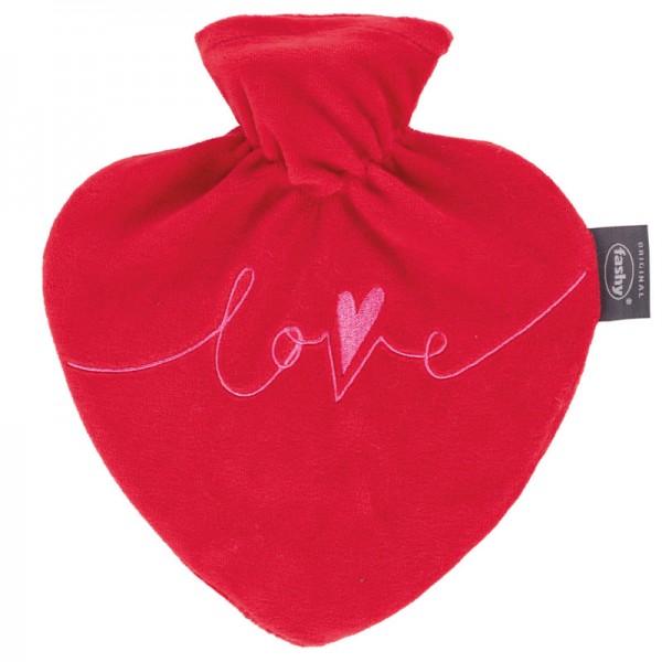 Cette bouillotte est en forme de coeur. Elle contient 0,7L d'eau, cachée sous sa douce petite housse rouge ornée du mot "Love", déclaration parfaite pour votre bien-aimé(e) ou pour la fête des mères.