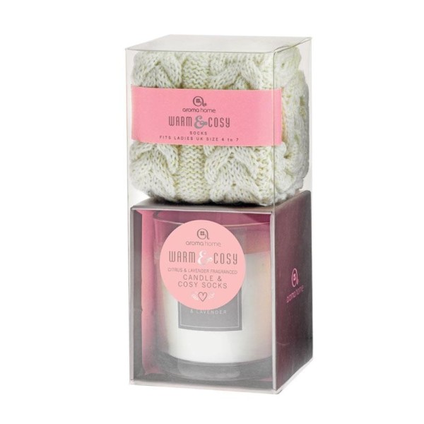 Lot comprenant une paire de chaussettes pour femmes de couleur blanche façon tricot avec sa bougie parfumée à la lavande et aux agrumes qui rendra plus chaleureuses vos soirées. Marque Aroma Home.